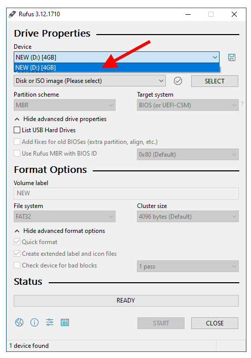 The next step would be to make sure you have some type of removeable media plugged in to your computer (USB stick in my case) and then run the Rufus application. When you are in Rufus, choose the device that you plugged in. In my case, the device would be a newly formatted USB stick.