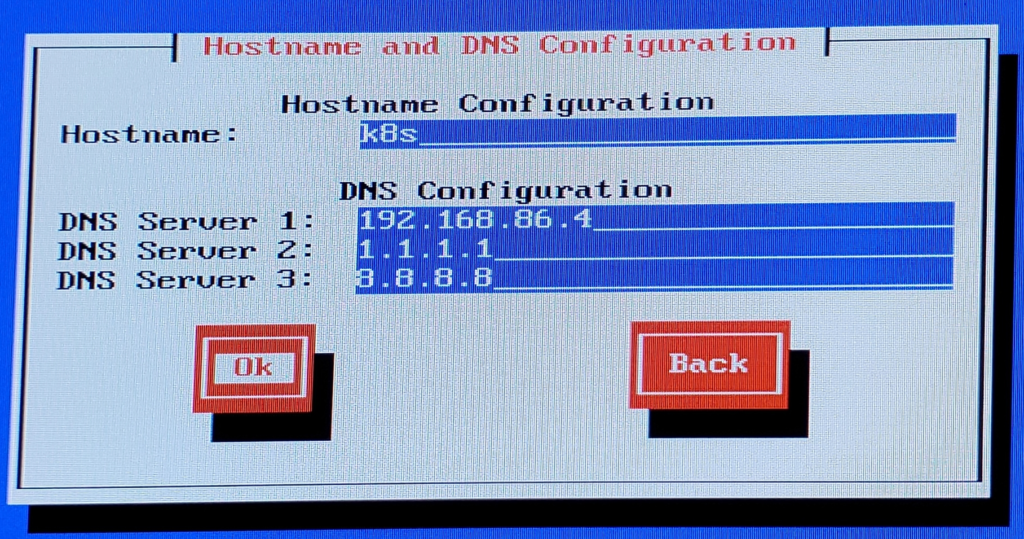 I also use a local DNS server on my network, so I choose that as my primary DNS entry for my XCP-ng machine. For for my secondary DNS servers, I entered first Cloudflare and then Google. We also need to set the Hostname for the server. Because I am going to be using this machine for a Kubernetes cluster installation, I chose the name “k8s” for my machine.