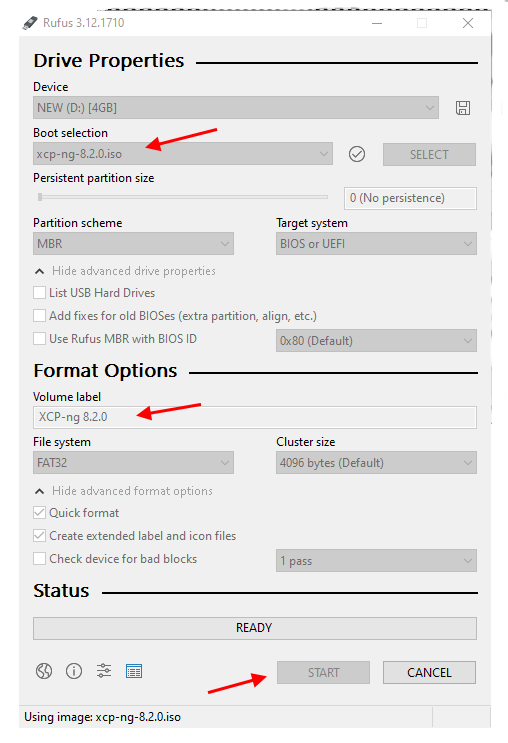 Let’s start with getting the XCP-ng ISO along with Rufus. We will use Rufus to create the install media for us. In my case, I will use an old USB stick I have laying around.