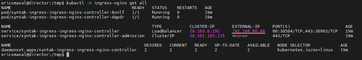 To explain that last line a little, here we are using Helm to install the Nginx Ingress Conrotroller and we are naming the Pod/DaemonSet as “syntak-ingress”, then we call out what we want to install which is the “ingress-nginx/ingress-nginx” chart from Helm. We will put this Pod/DaemonSet in the “ingress-nginx” namespace and we will use the config that we updated when we moved the ingress-nginx installation config into the yaml file in the “tmp” directory.