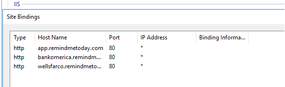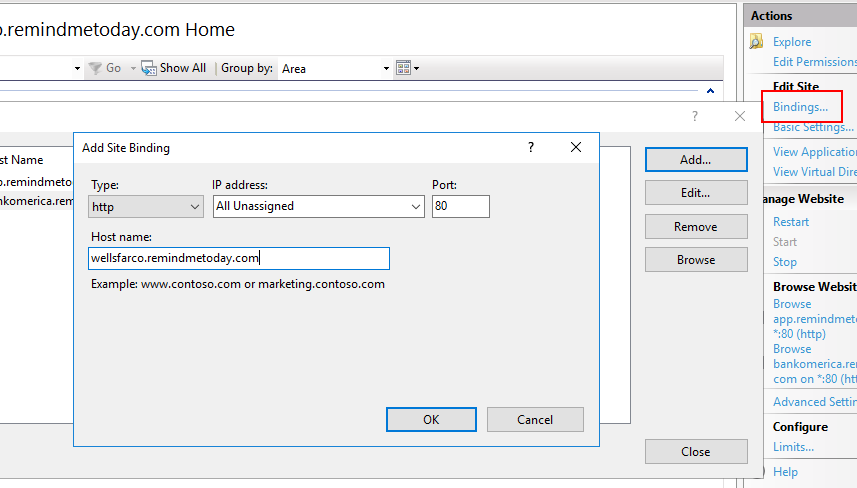 The last part is to edit the Web Site and add Binding to it. Here I am adding the subdomain wellsfarco.remindmetoday.com to my app.remindmetoday.com site. Do the same thing for bankomerica.remindmetoday.com.