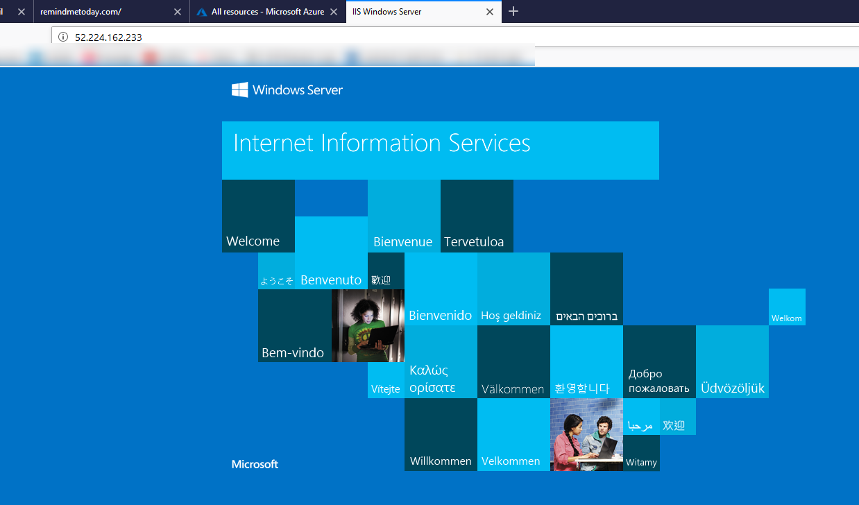 After the IIS install completes, go to a browser and enter the Public IP that we acquired earlier. If everything went right, you should see the default IIS web page.