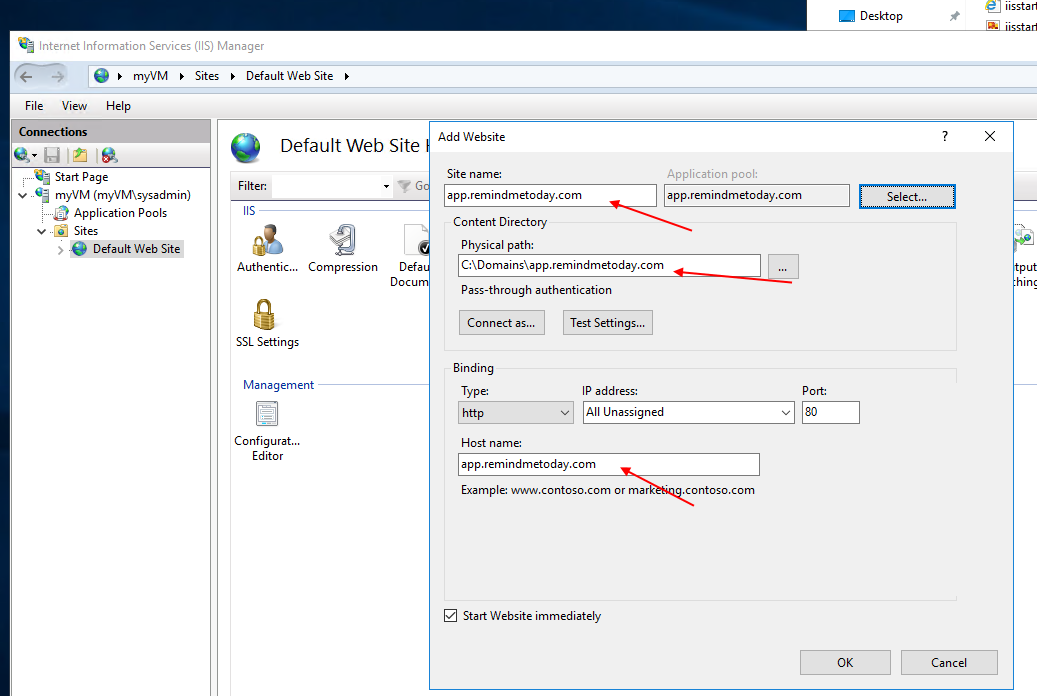 We now create a new Web Site. I have named the Web Site “app.remindmetoday.com” and set a path to a directory on the server that just has an index.html page.