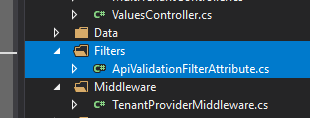 Now we must create a validation filter to trigger the object validations for us. I have added a new folder called “Filter” to the project and also added a new class called “ApiValidationFilterAttribute”.