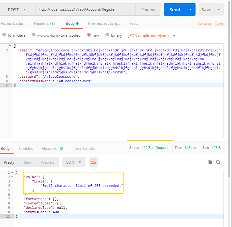 Back to Postman! If I add a couple of characters to my email address in a Register call, we can see that we get a 400 error back not and not a generic 500 server error. In addition, we even get a message on what went wrong.