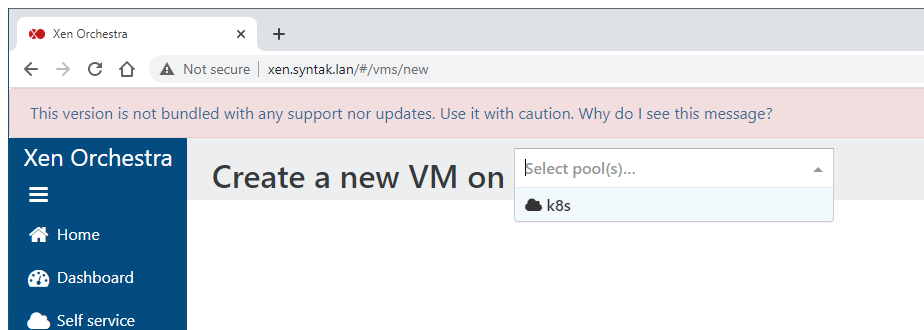 We will now need to select the Pool where our virtual machines will live. Remember from the last article, the pool was created when we initially logged in our Xen Orchestra app and added a server.
